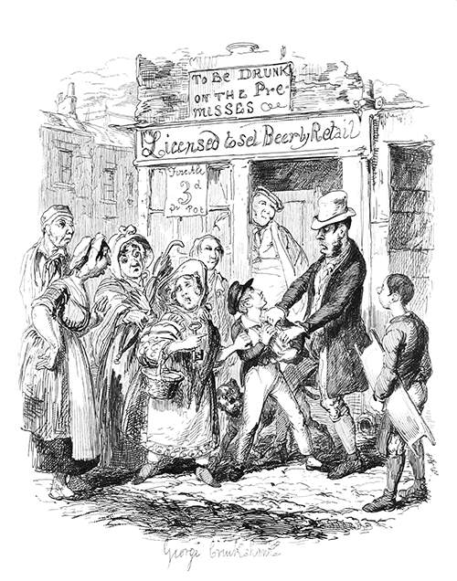 In front of a beer shop, a man and a woman want to force a boy to come with them and try to convince a little group of by-standers to take their side.