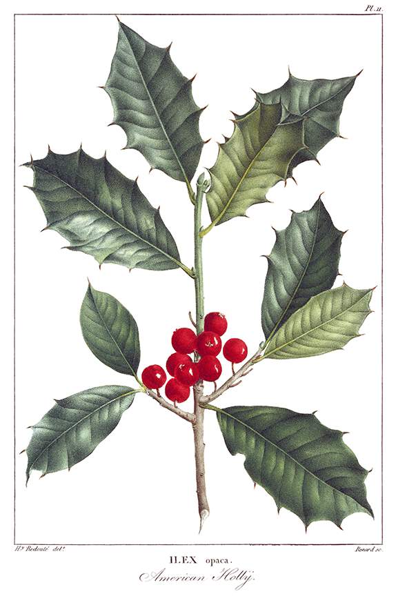 Stipple engraving showing leaves and fruit on a branch of American holly (Ilex opaca), an evergreen tree in the family Aquifoliaceae, native to North America. This tree is described as follows by the author: