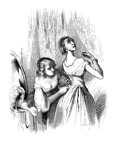 The caption reads in the original French: L’une est une coquette surannée qui se couche après avoir laissé ses cheveux, ses sourcils et ses dents sur sa toilette.