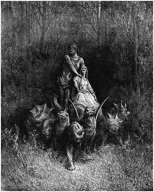 A man stands next to a seated woman as monstrous creatures are gathered around them.