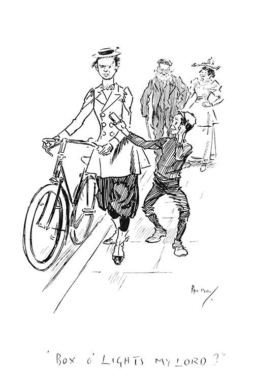 A woman walks alongside her pushbike in her riding outfit as she is approached by a street urchin who wants to sell her matches and mistakes, or pretends to mistake her for a man.