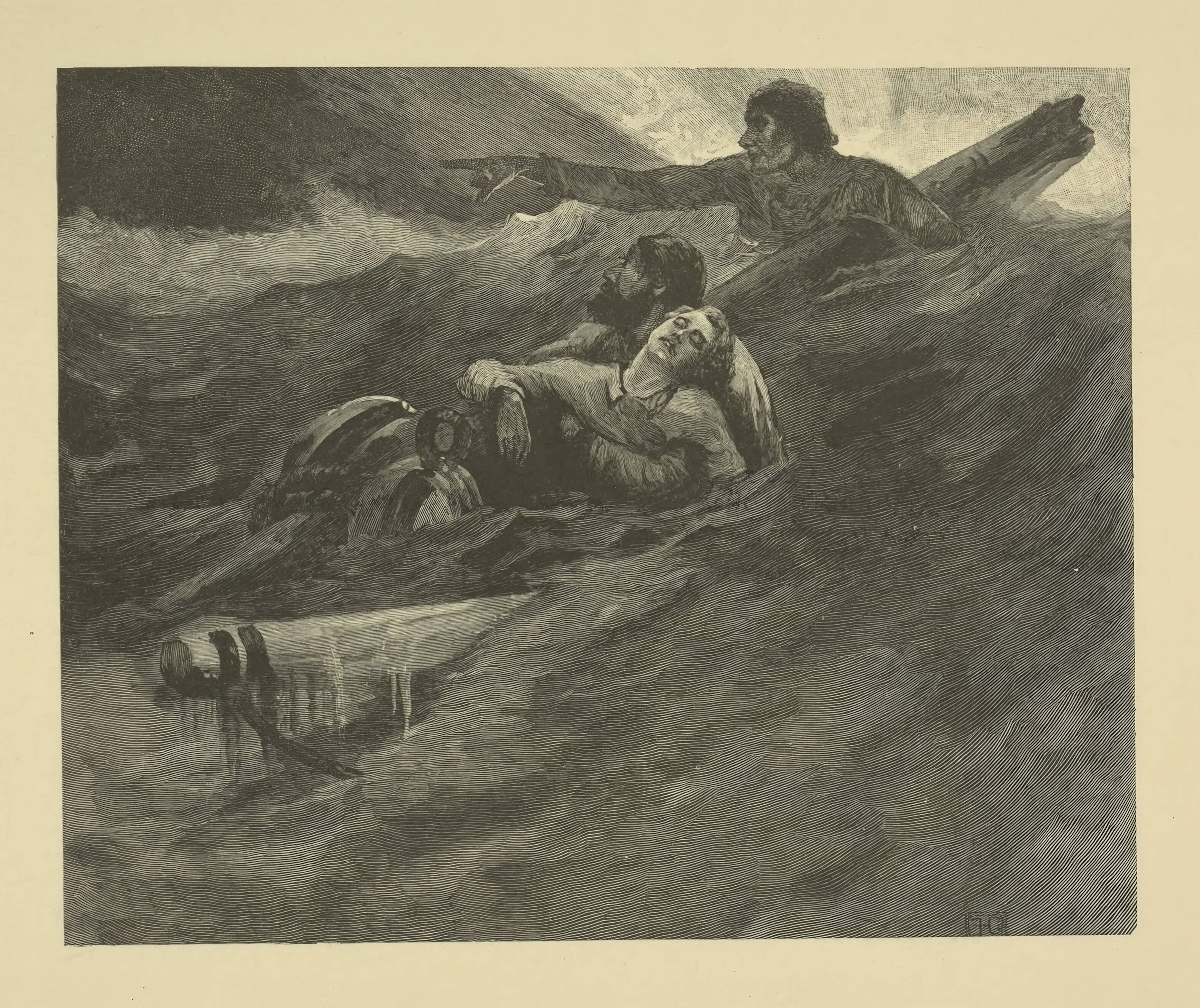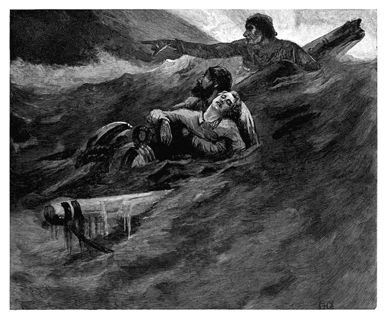 Three shipwrecked men are partially submerged in a turbulent sea, surrounded by waves and ripples. One has wrapped his arm around the chest of his passed-out companion to keep him afloat, while clinging to a spar. The third man, holding on to the same piece of wood, points to the left with his right hand.