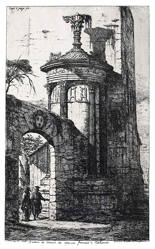 View of the Choragic Monument of Lysicrates as it stood when still part of a Capuchin monastery, with two conversing figures walking through the archway.