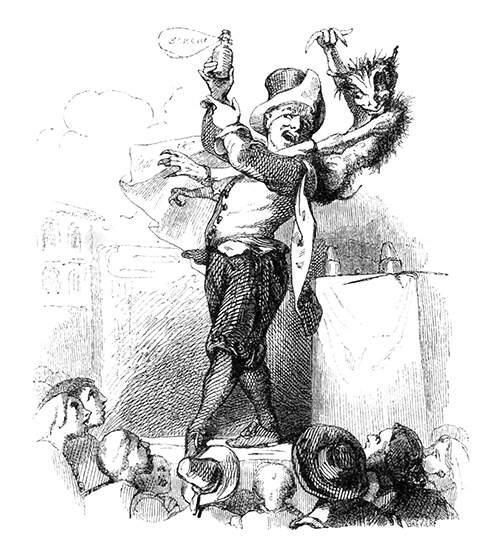 A snake oil seller addresses the audience from a platform, while a demon perched on his shoulders throws up the horns.