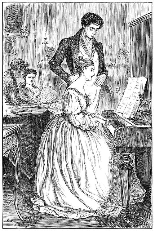 A man stands beside a woman playing the piano, ready to turn the pages of her sheet music.