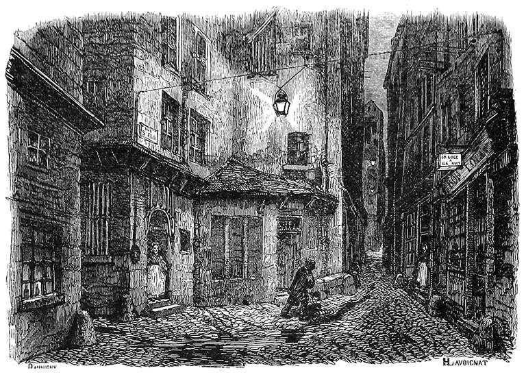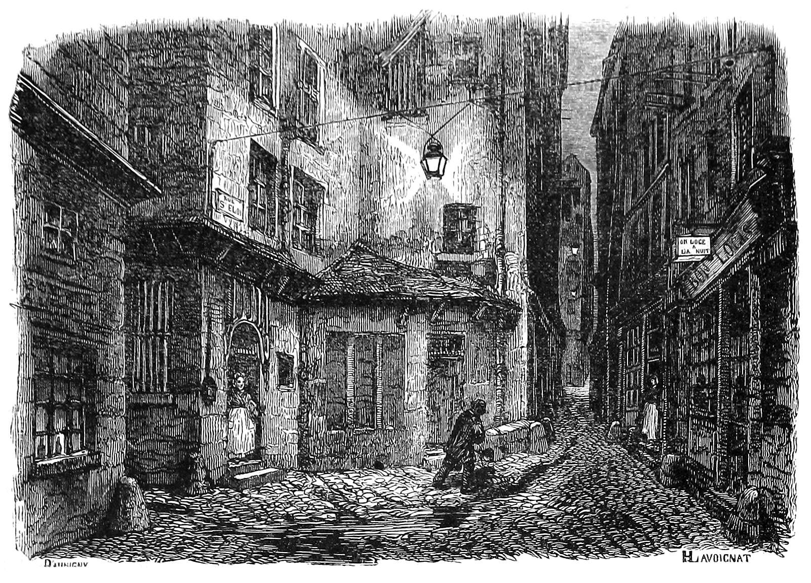 Night view of a narrow cobbled street in pre-Haussmann Paris.