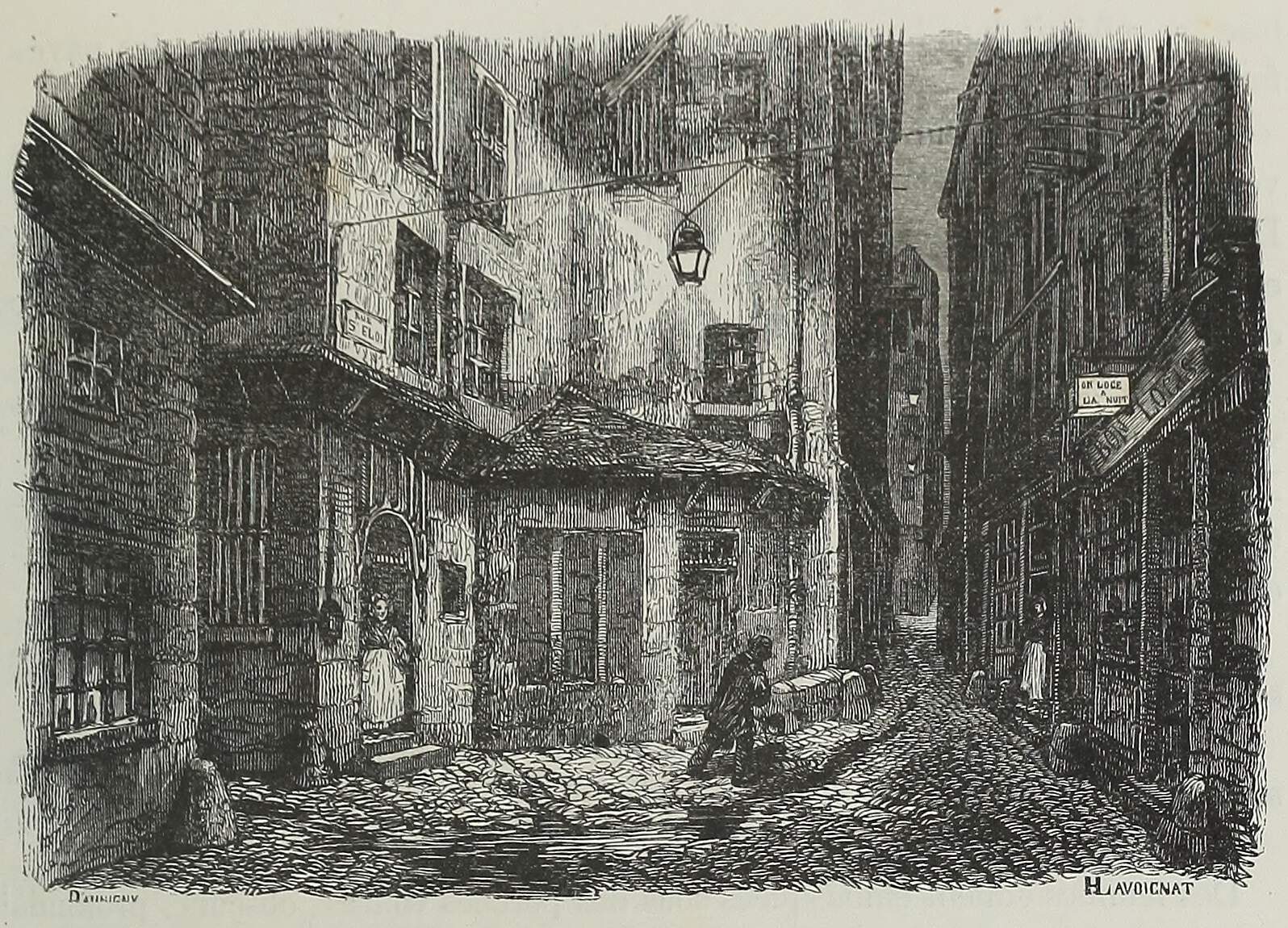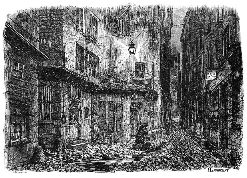 The caption reads in the original French: La Cité, dédale de rues obscures, étroites et tortueuses.