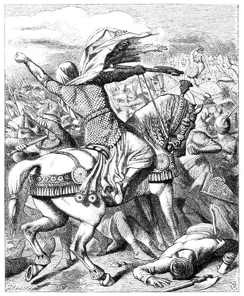 A man on horseback, holding an ax, is seen from behind as he takes part in a battle, menacingly shaking his fist while the back of his headscarf flutters in the wind.