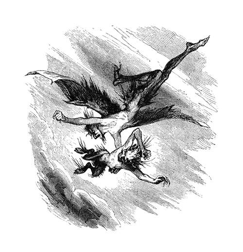 Two devils with animal features such as wings and goat’s legs are fighting in the sky.