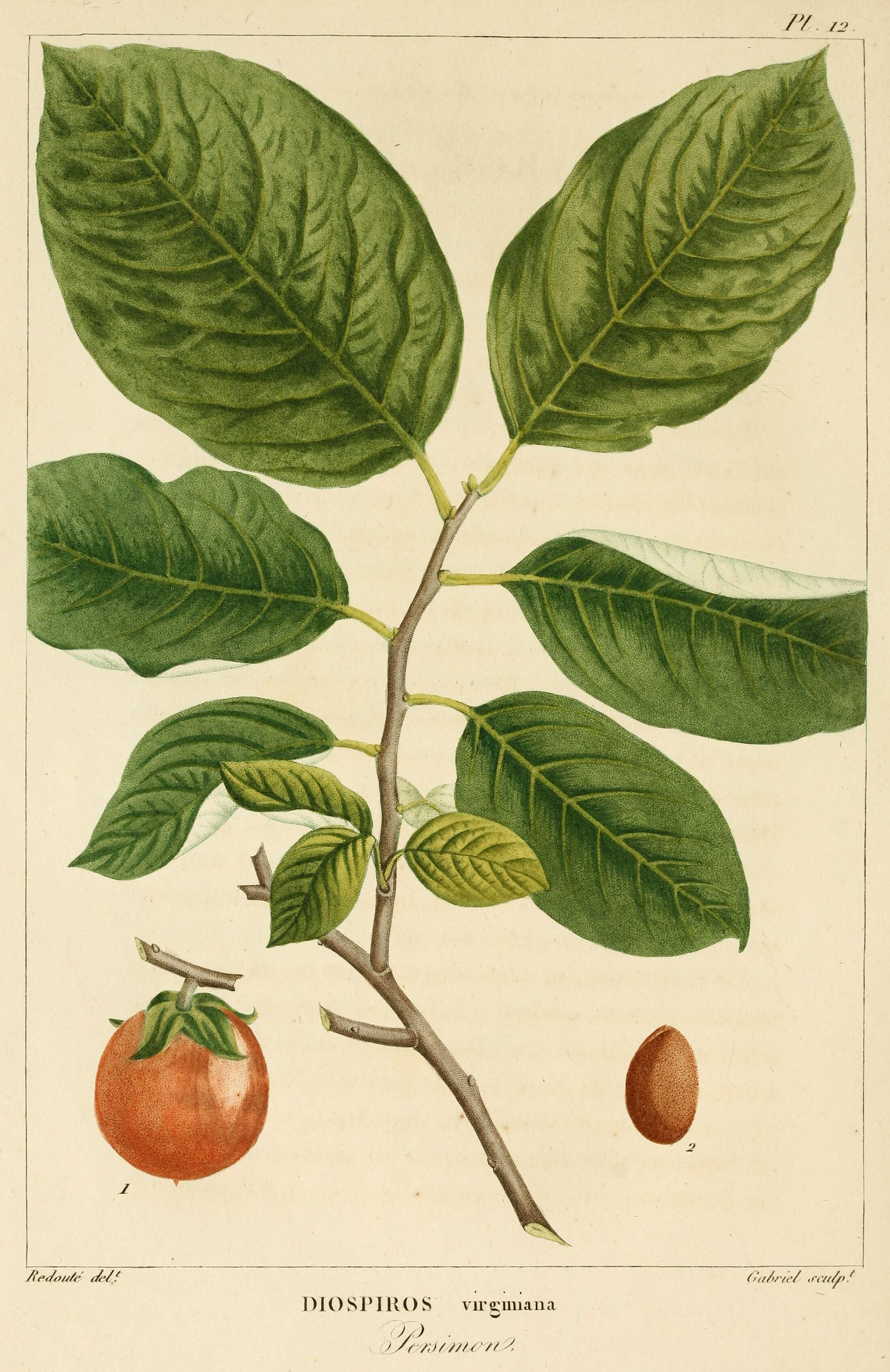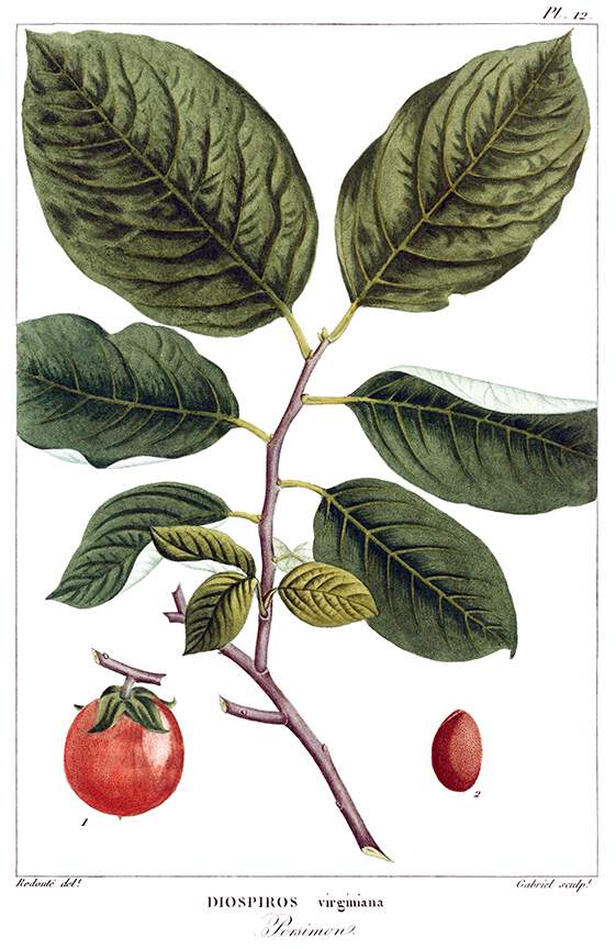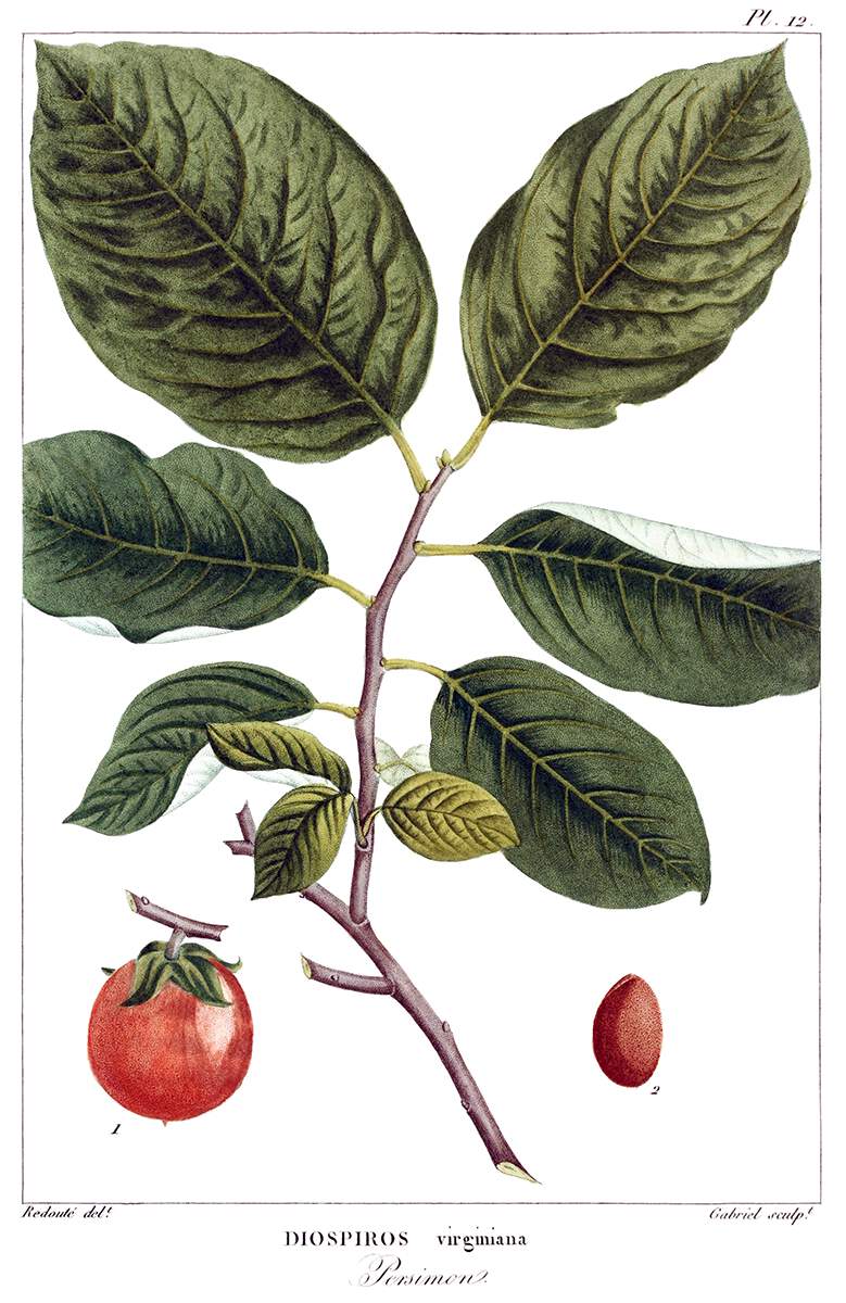 Stipple engraving showing leaves and fruit of American persimmon (Diospyros virginiana), a tree in the family Ebenaceae native to North America. This tree is described as follows by the author:
