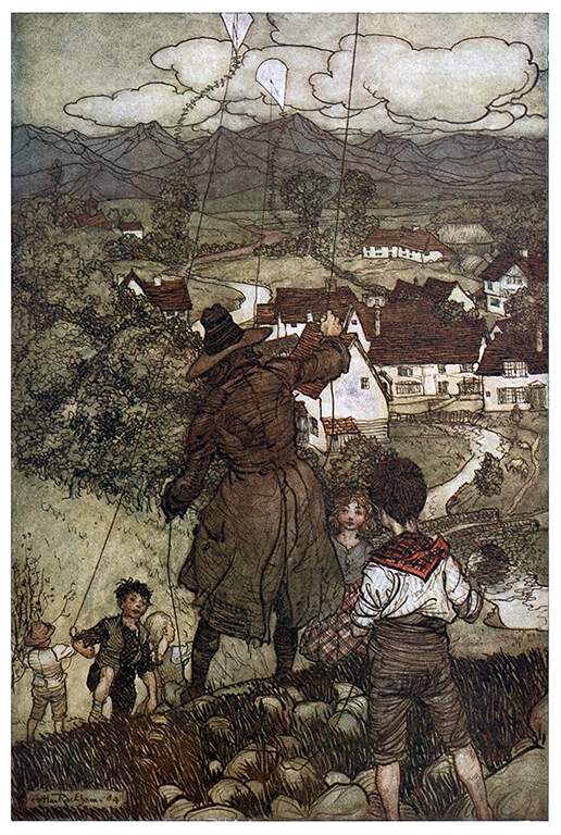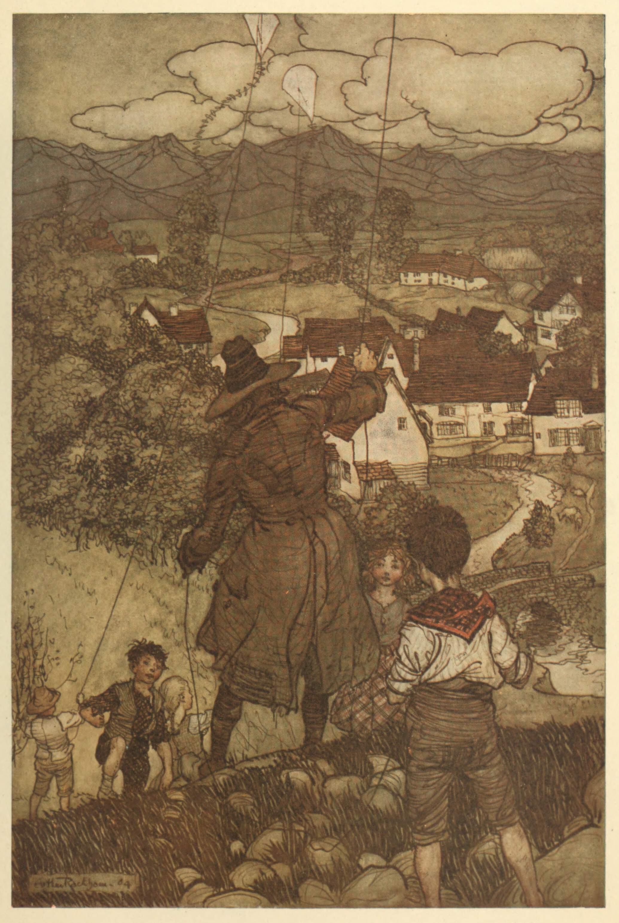 A man wearing a three-quarter-length coat and a hat is seen from behind flying a kite with children from the slopes of a hill overlooking a nearby village.