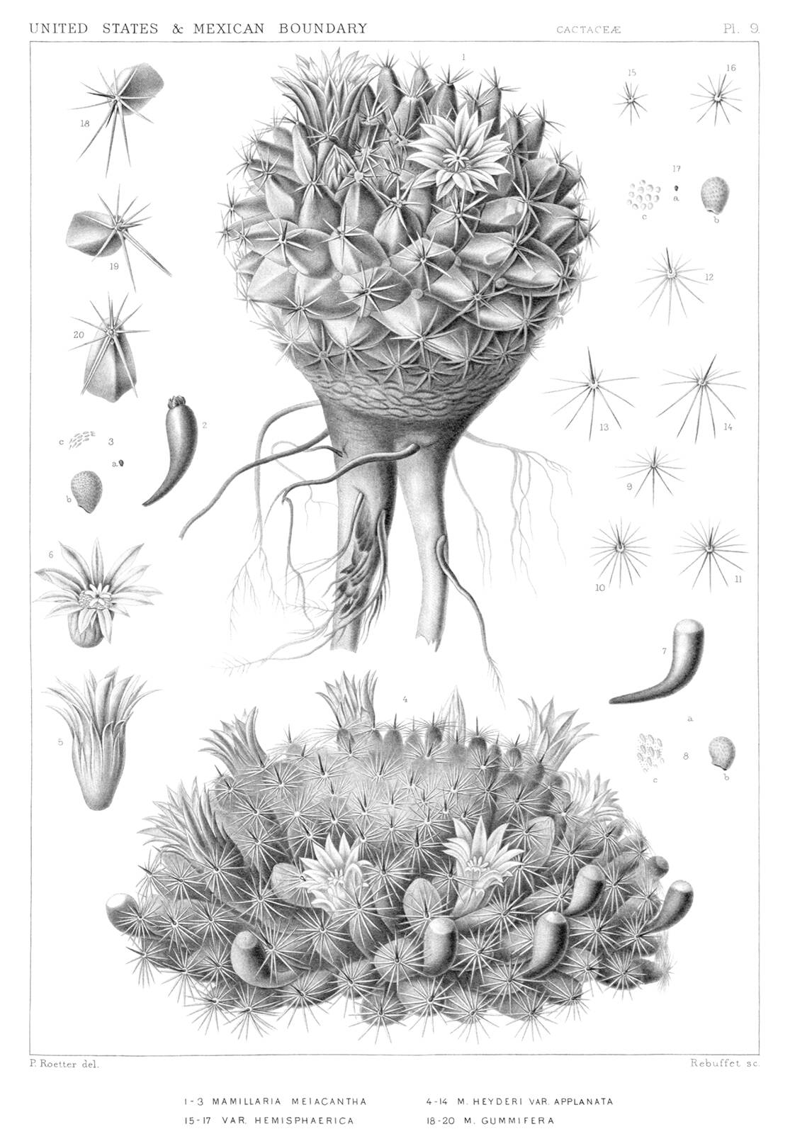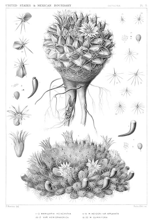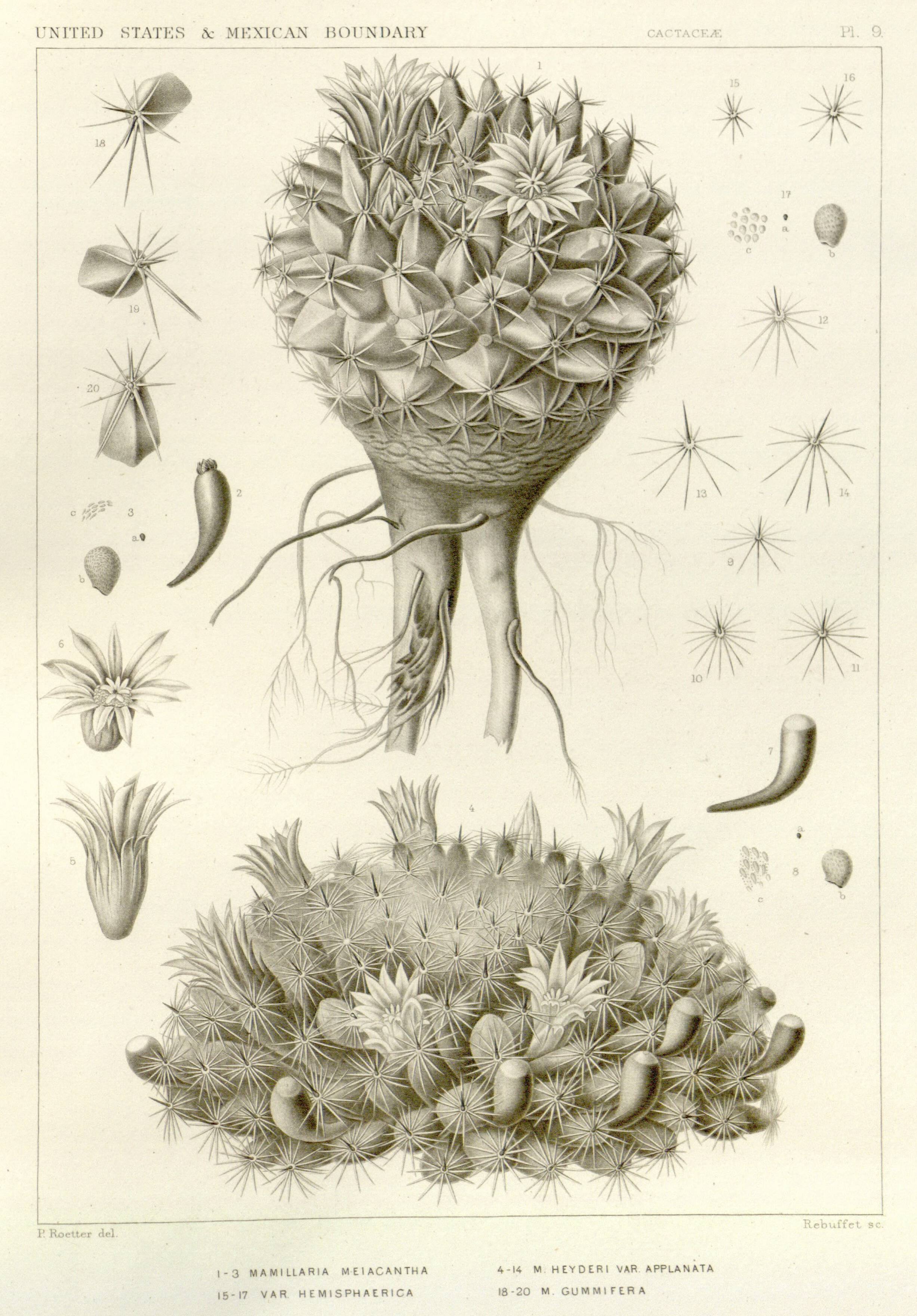 Botanical steel engraving showing subspecies of Mammillaria heyderi, namely M. heyderi subsp. gummifera, M. heyderi subsp. hemisphaerica, and M. heyderi subsp. meiacantha. M. heyderi subsp. hemisphaerica and M. heyderi var. applanata are currently considered to be synonyms. Mammillaria heyderi is a plant in the family Cactaceae, native to Mexico and the United States.
