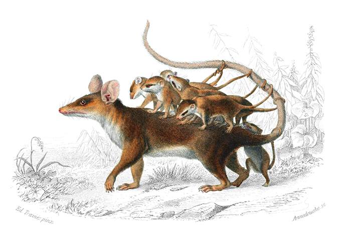 Hand-colored steel engraving showing a mouse opossum (Marmosa murina) seen from the side, carrying her litter on her back. Linnaeus’s mouse opossum is a marsupial in the family Didelphidae, native to South America.