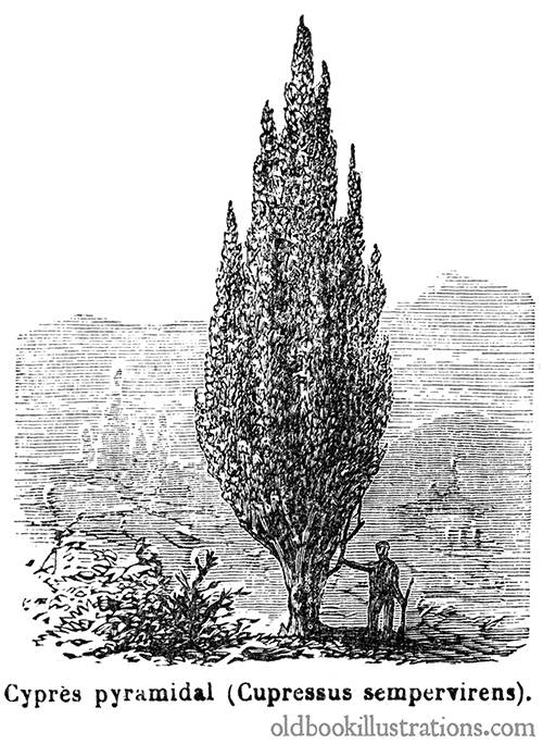 The caption reads in the original French: Cyprès pyramidal (Cupressus sempervirens)