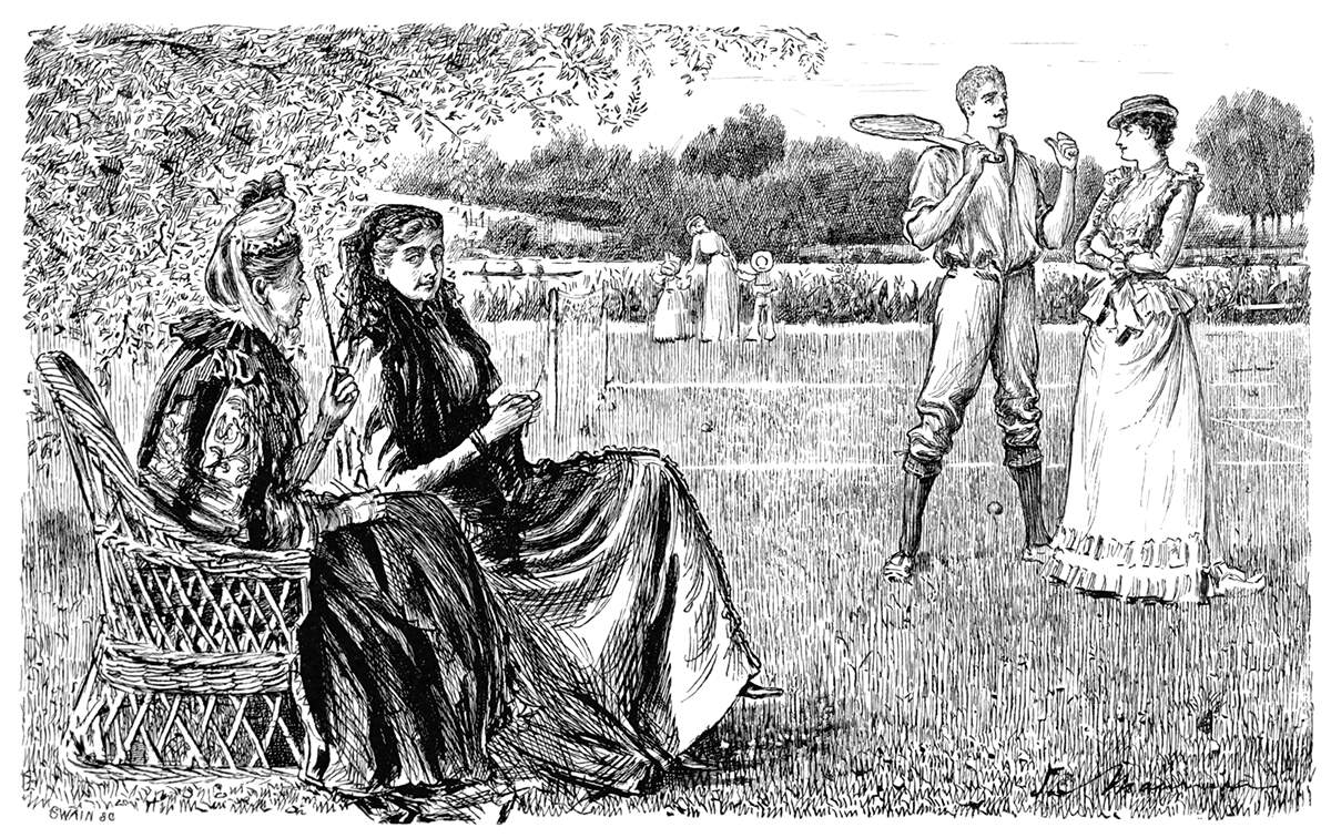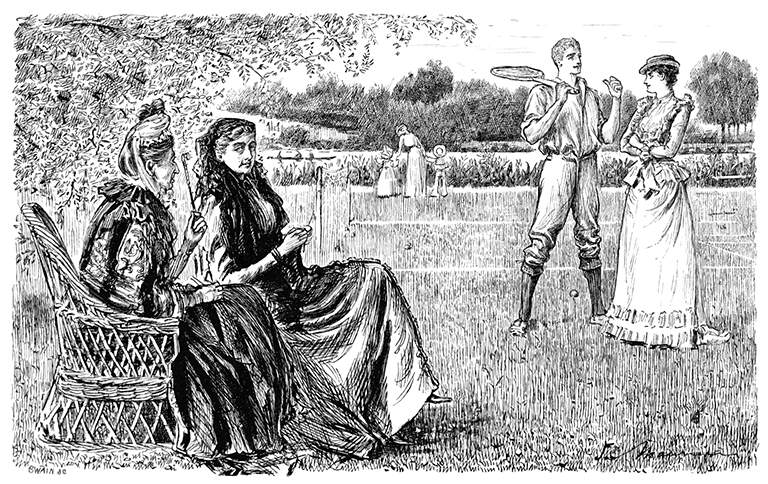 Two women are sitting on the side of lawn tennis court, chatting together while looking at a young couple standing a few yards away, the man with his tennis racket slung over his shoulder.