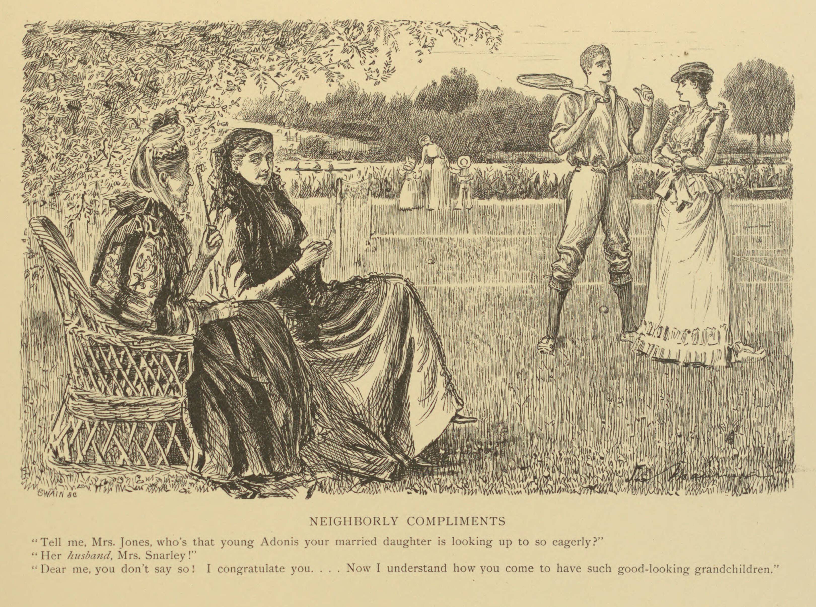 "Tell me, Mrs. Jones, who's that young Adonis your married daughter is looking up to so eagerly?"