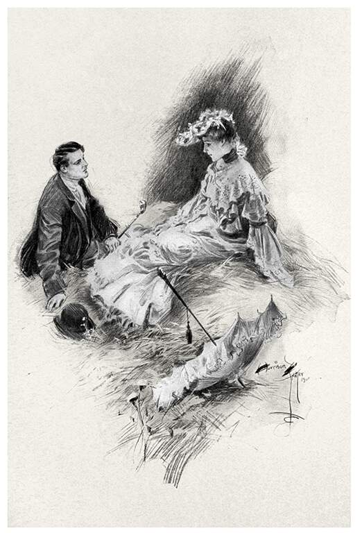 A man and a woman are sitting on the ground outdoors and talking together, the man with a golf club in one hand and his hat at his side, the woman with her parasol lying upside down next to her.