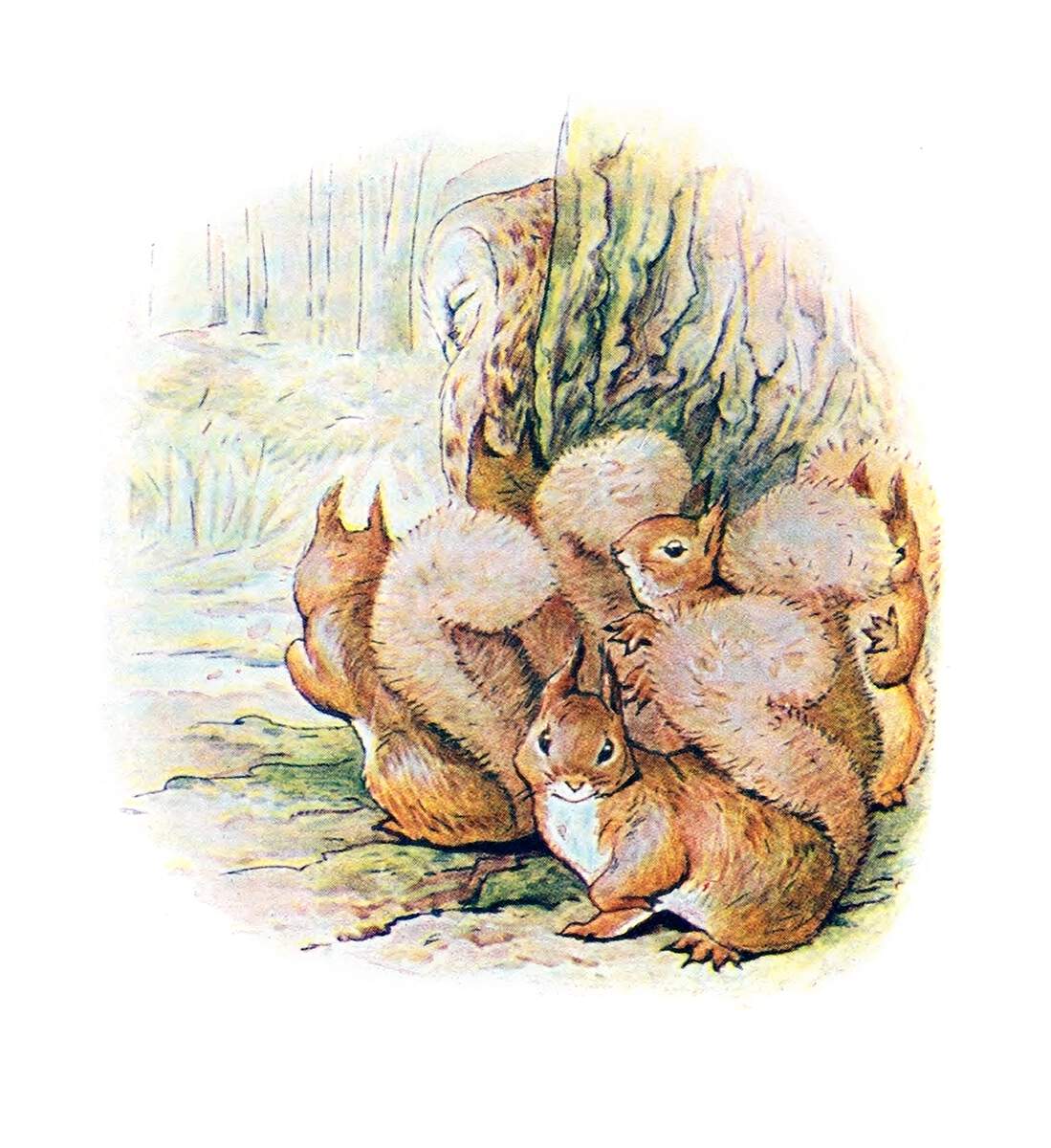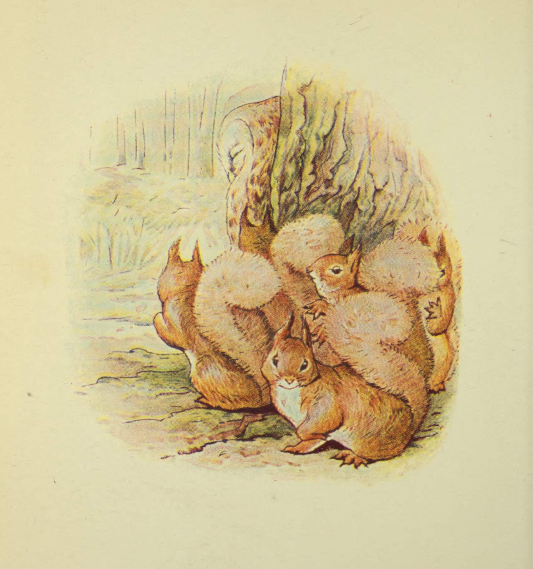 A group of squirrels has stopped by a tree, looking inquisitively in all directions, while a sleepy owl can be seen from the side, its back to the trunk.