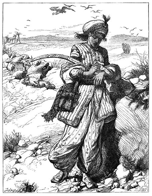 A young man wearing a turban and carrying a scimitar bandages his left wrist while vultures circle around the body of his dead horse, which is visible in the background.