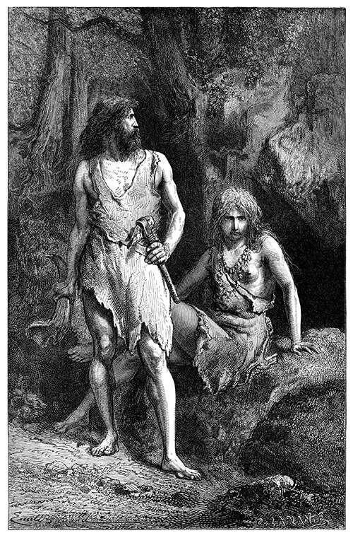 A man stands in a wooded area holding an ax in one hand and an animal’s jawbone in the other. He looks to the side as a woman sits beside him.