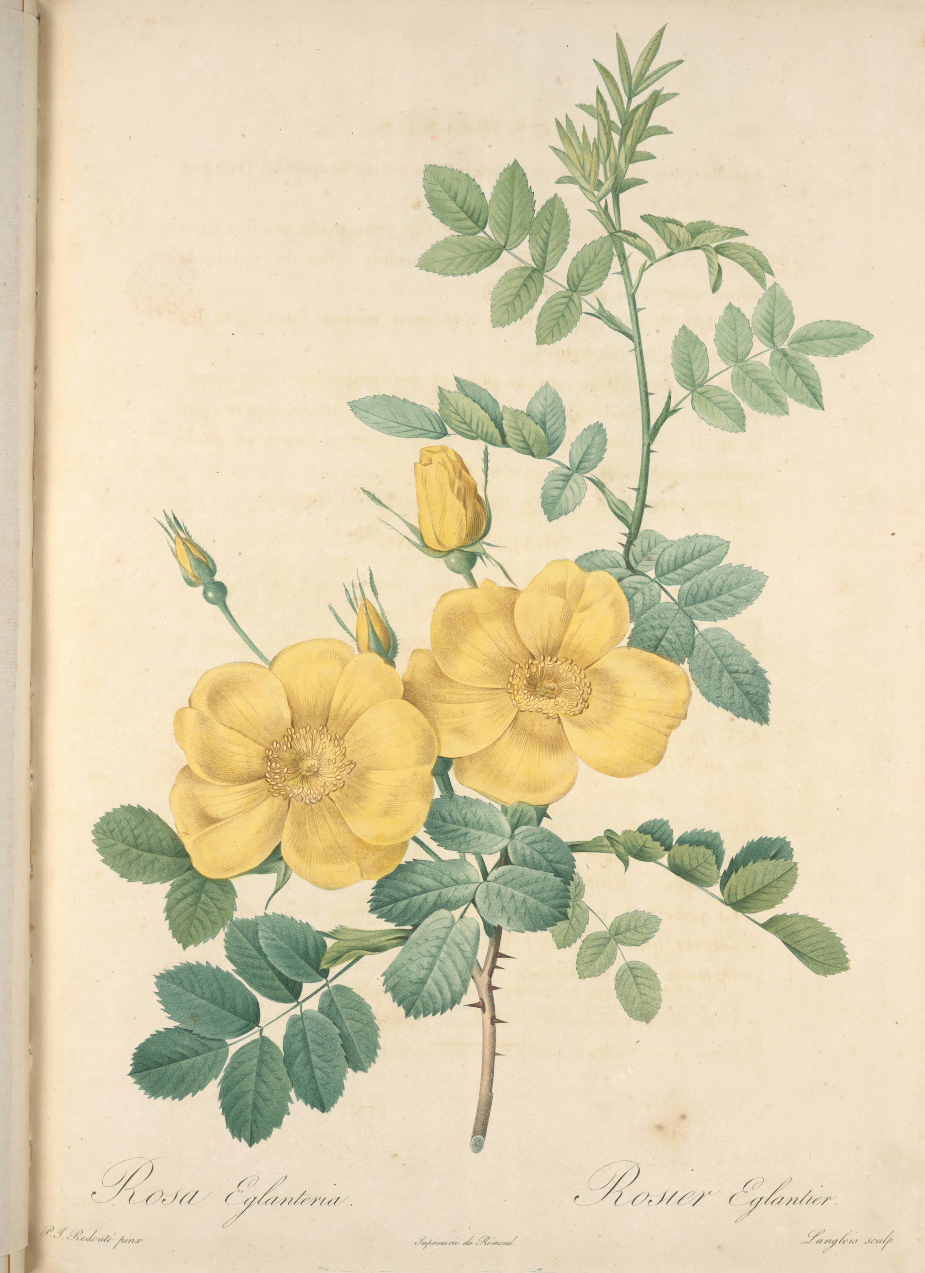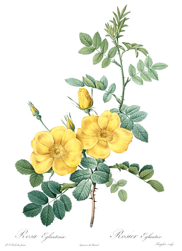 Stipple engraving depicting a branch of Rosa foetida, referred to by the author as Rosa eglanteria, that features two yellow blooms along with buds and leaves. Rosa foetida is native to the Caucasus Mountains and was imported to Europe, which has no native yellow rose, from Persia. Rosa eglanteria is currently considered a synonym of Rosa rubiginosa, the sweetbriar rose.