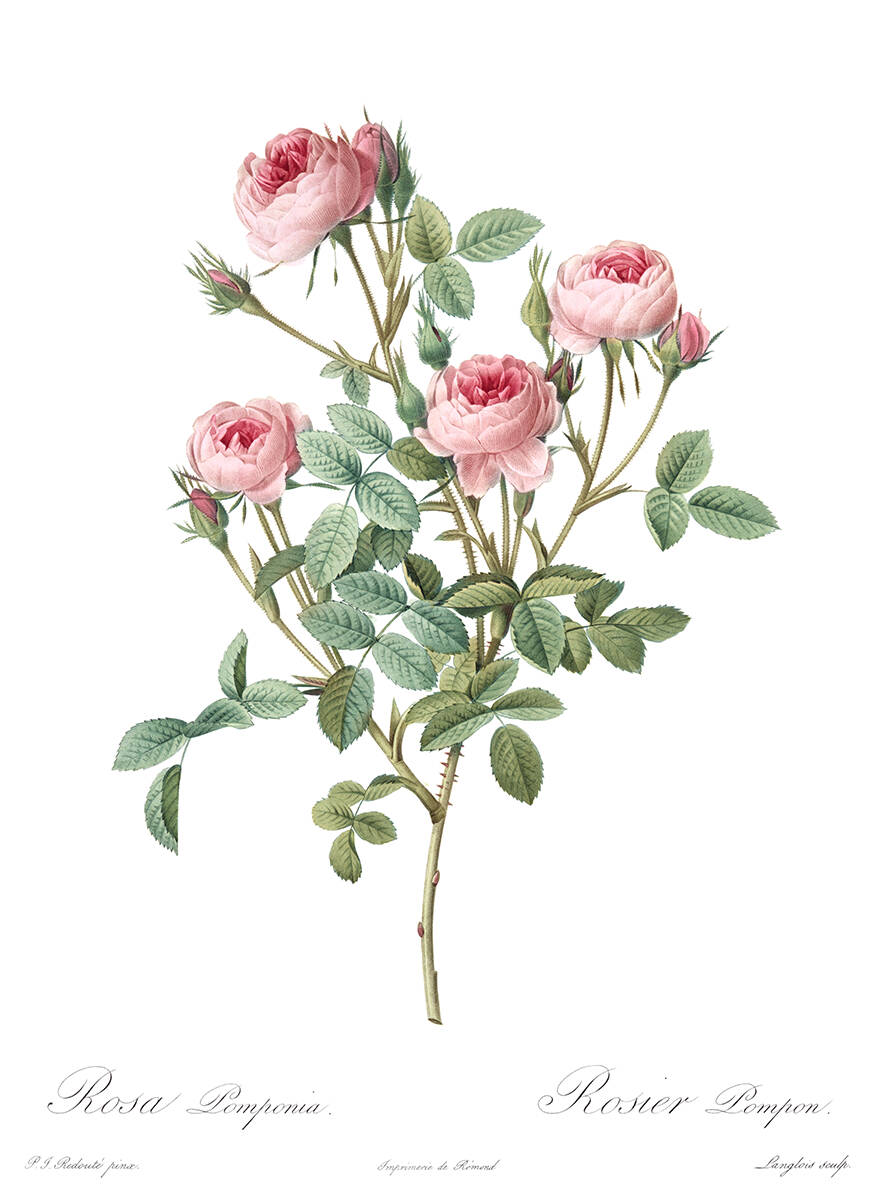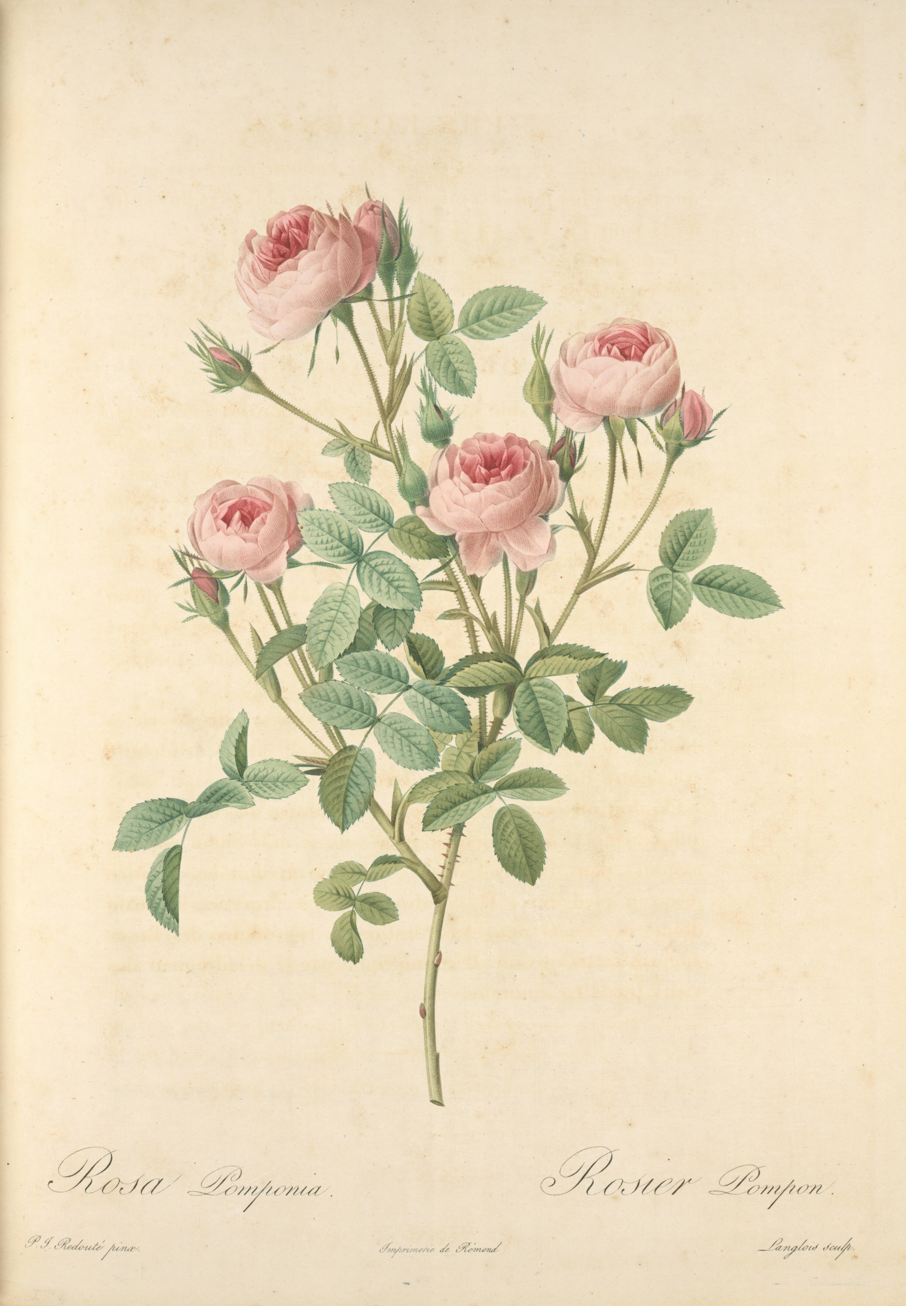 Stipple engraving depicting a branch of Rosa pomponia featuring four rose-pink blooms, along with buds and light green, serrated leaves. Rosa pomponia is a shorter cultivar of Rosa × centifolia, also known as 'Rose de Meaux.'