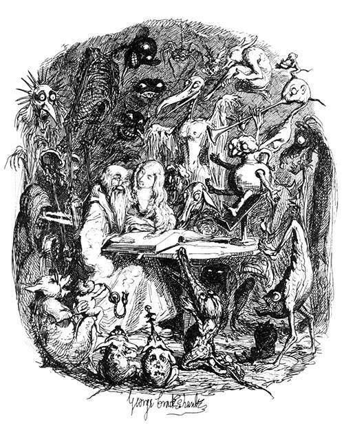 Saint Anthony is depicted as an older cleric sitting at a table with a large book open before him, surrounded by horrific and taunting visions.