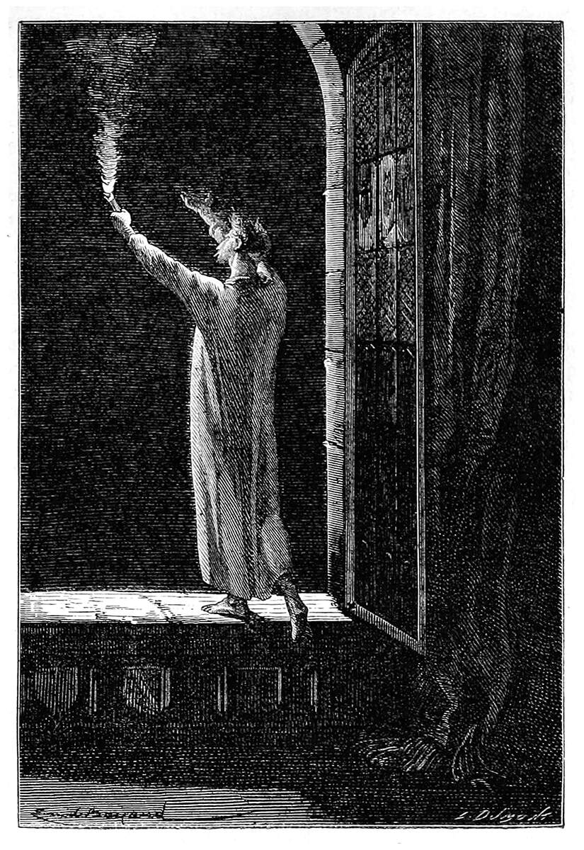 A man in a nightshirt stands on a windowsill holding a torch and gesturing toward the night sky.