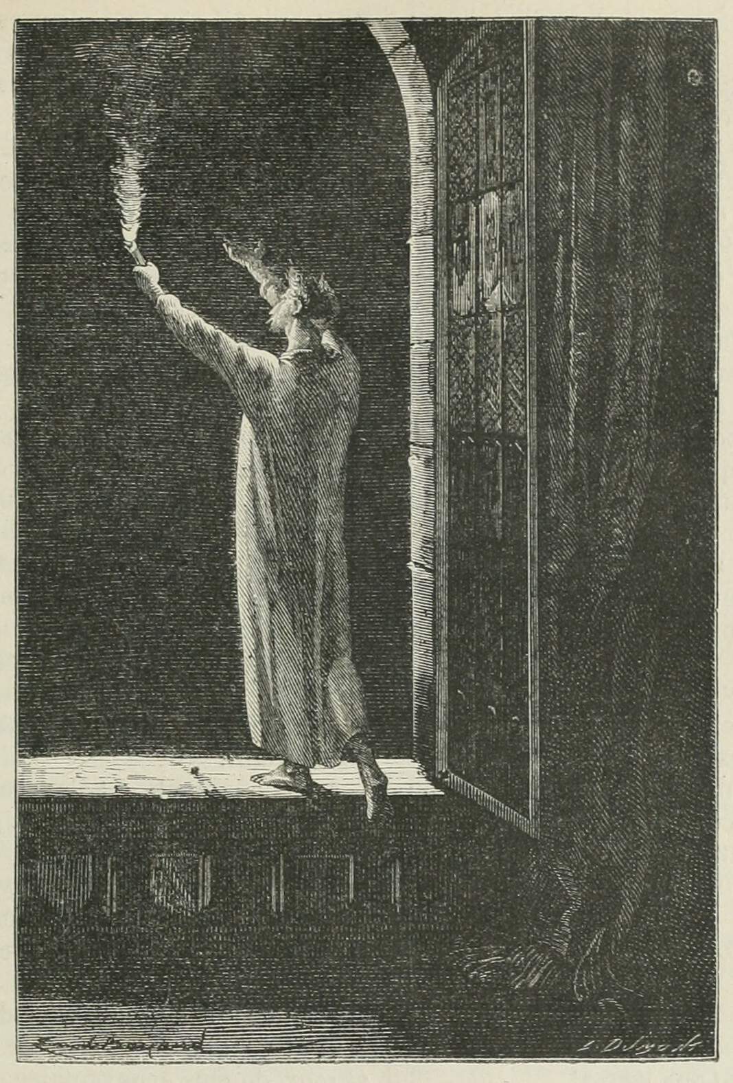The caption reads in the original French: Le comte, en chemise, debout sur cette fenêtre…
