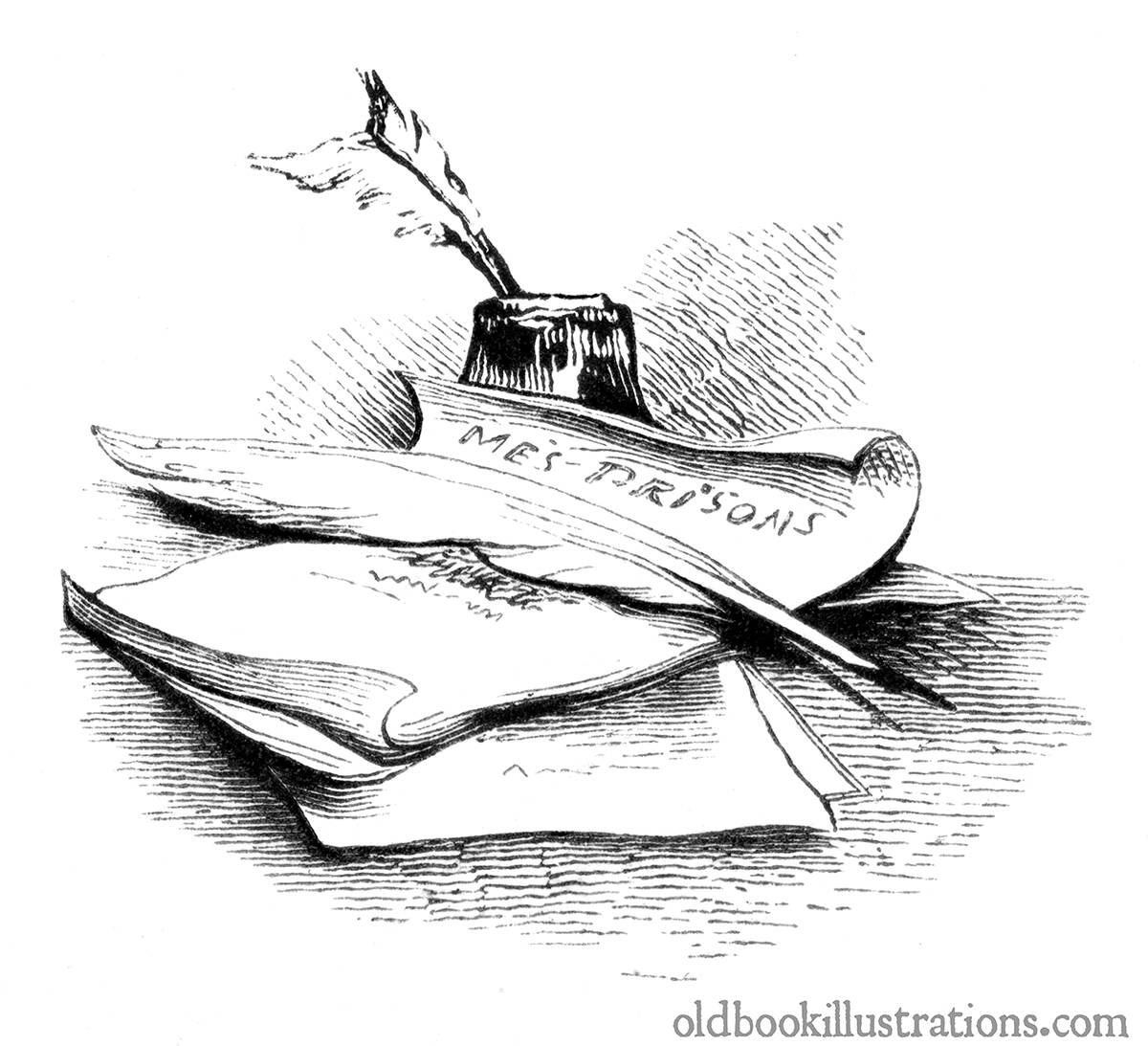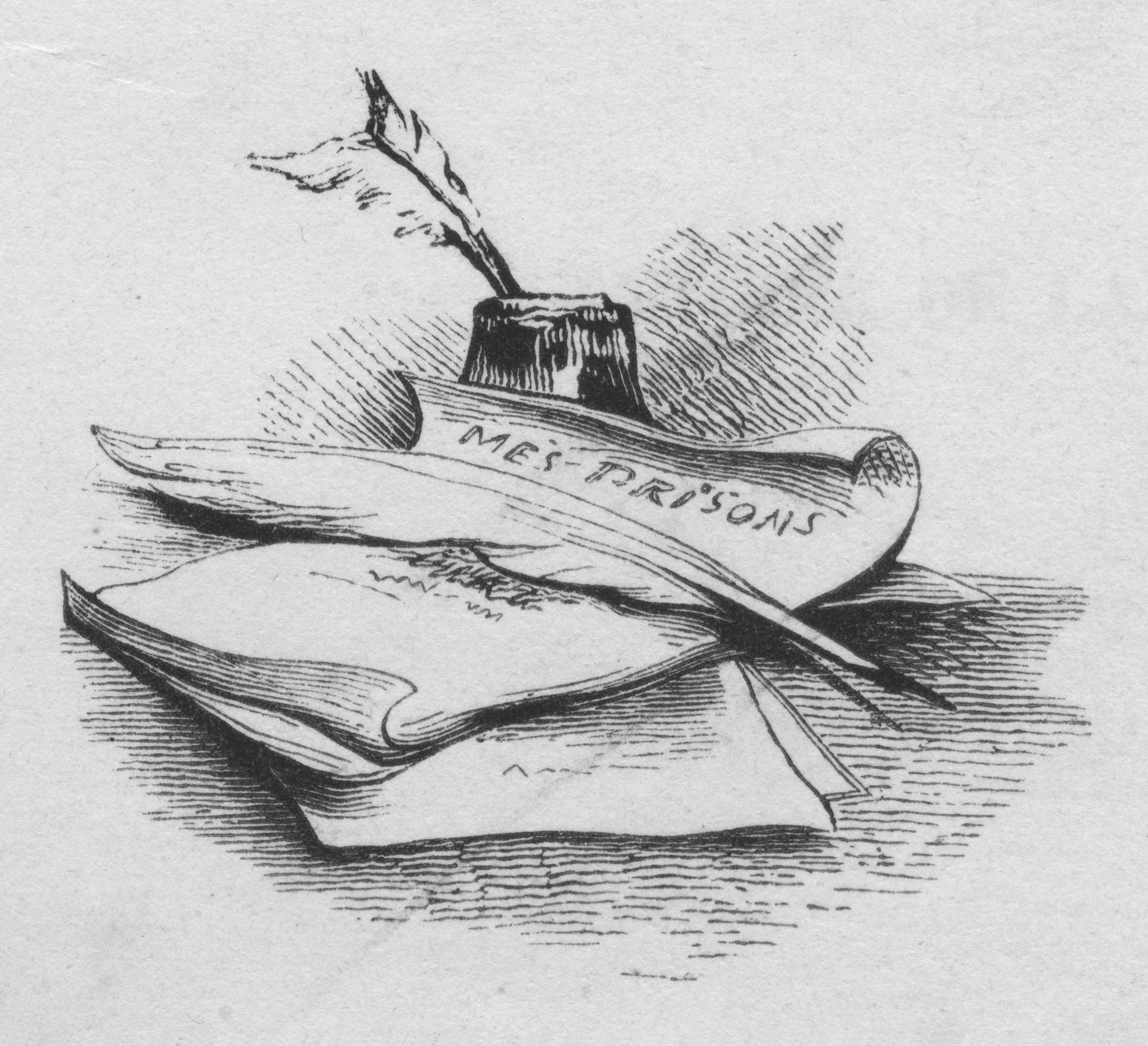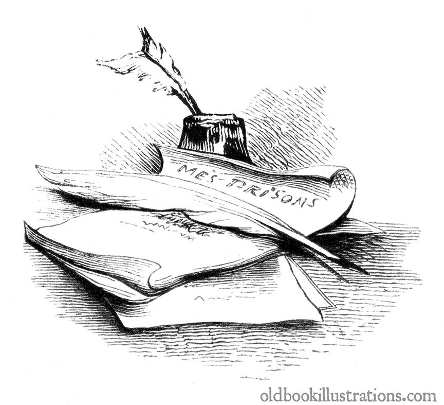 A few written sheets of paper are loosely gathered on a table, with a quill-pen resting upon them. The first page bears the title >Mes prisons, while in the background is an ink bottle, with another quill.