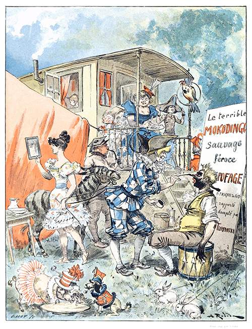 A circus company is getting ready for the coming performance, dressing and making up outside the wagons.